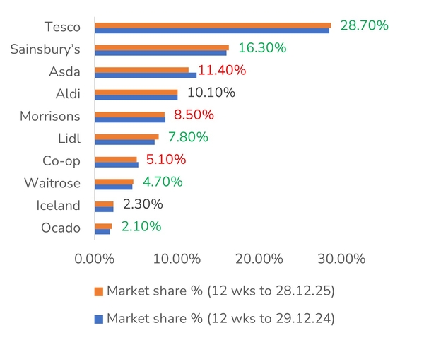 Sainsbury's and Tesco led the Big Four in reported sales growth. Sainsbury's delivered a xx% rise in grocery sales over the six weeks to 6 January, citing strong loyalty uptake and own brand ranges. Tesco grew UK like for likes by xx% in its core food business.