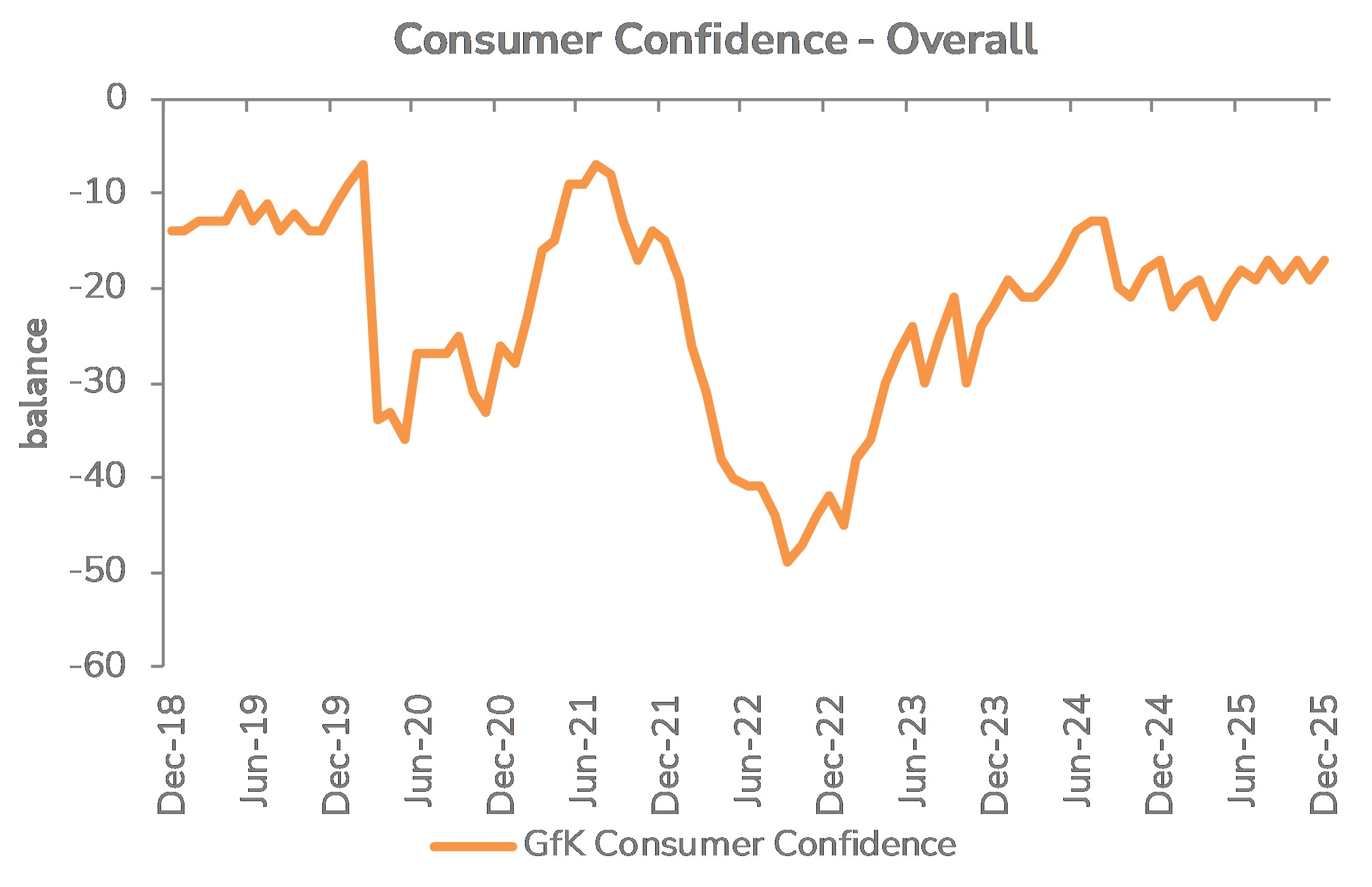 • While the impact of the late November Budget has faded, leading to an uptick in confidence in December to xx points, wider economic uncertainty continued. Consumers felt more confident about their ability to manage their personal finances, but pessimism about the economy continued to dampen spending.