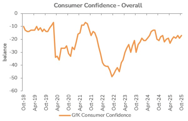 Consumer confidence showed conflicting signs in October, with the headline rate rising two points to -xx, which included a xx rise in the major purchase index as shoppers warmed up for Black Friday. However, confidence in household finances remained unsteady, with the continued elevated cost of living remaining on the list of consumers’ worries.
