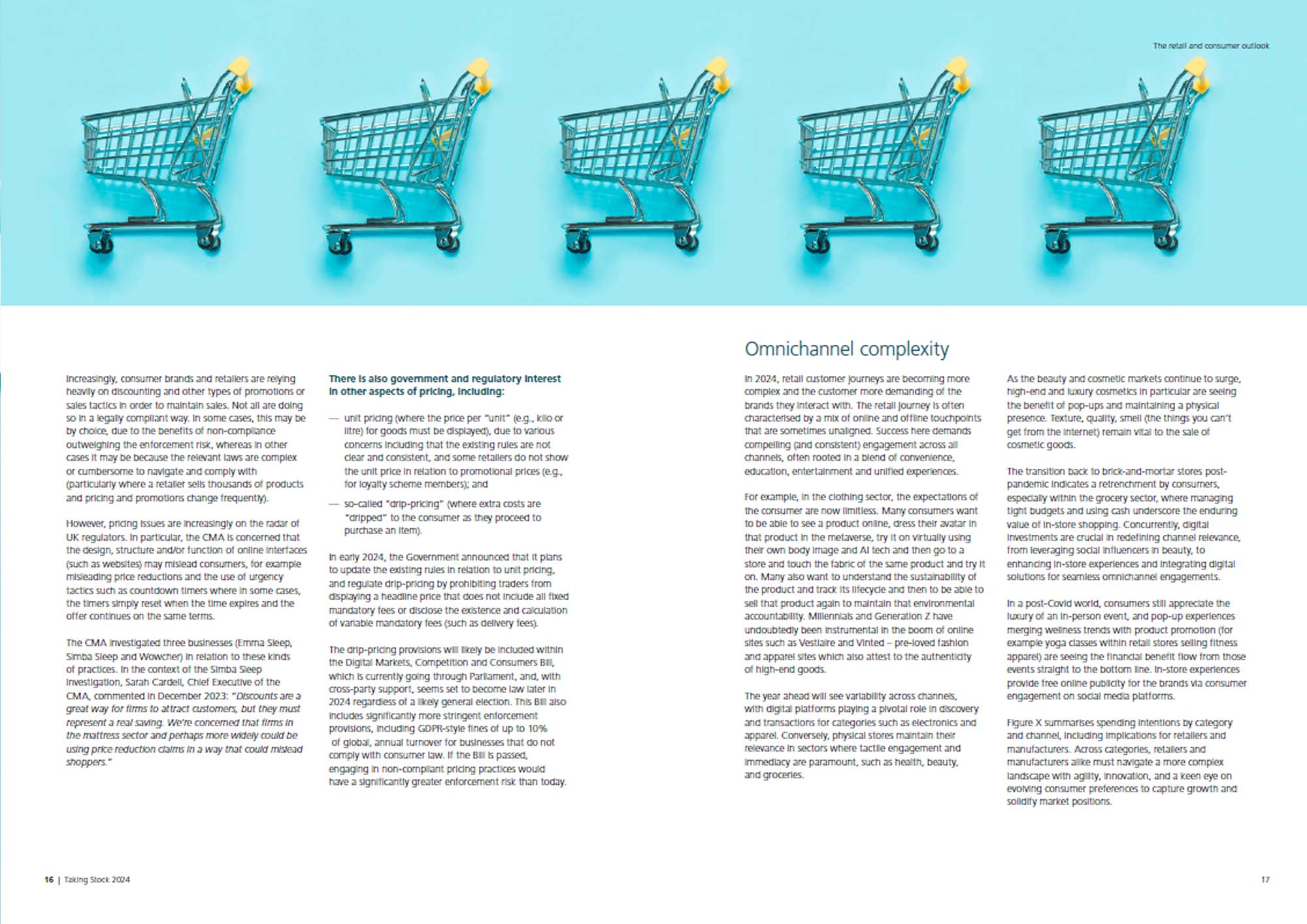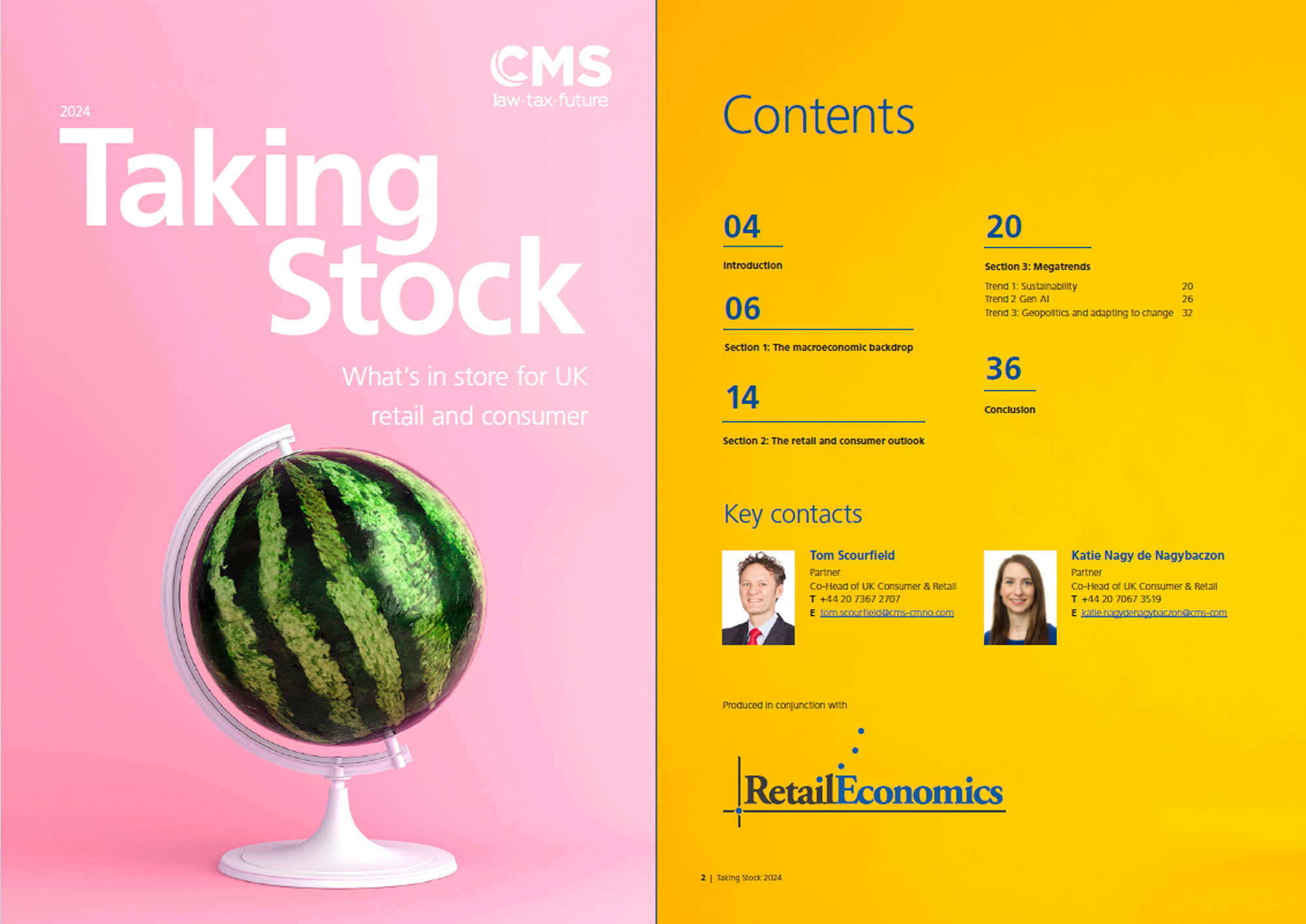 Our report 'Taking Stock 2024 - What's in store for UK retail and consumer' (produced in partnership with CMS) looks at the outlook for retail and consumer in 2024 and trends to watch in 2024 and beyond.