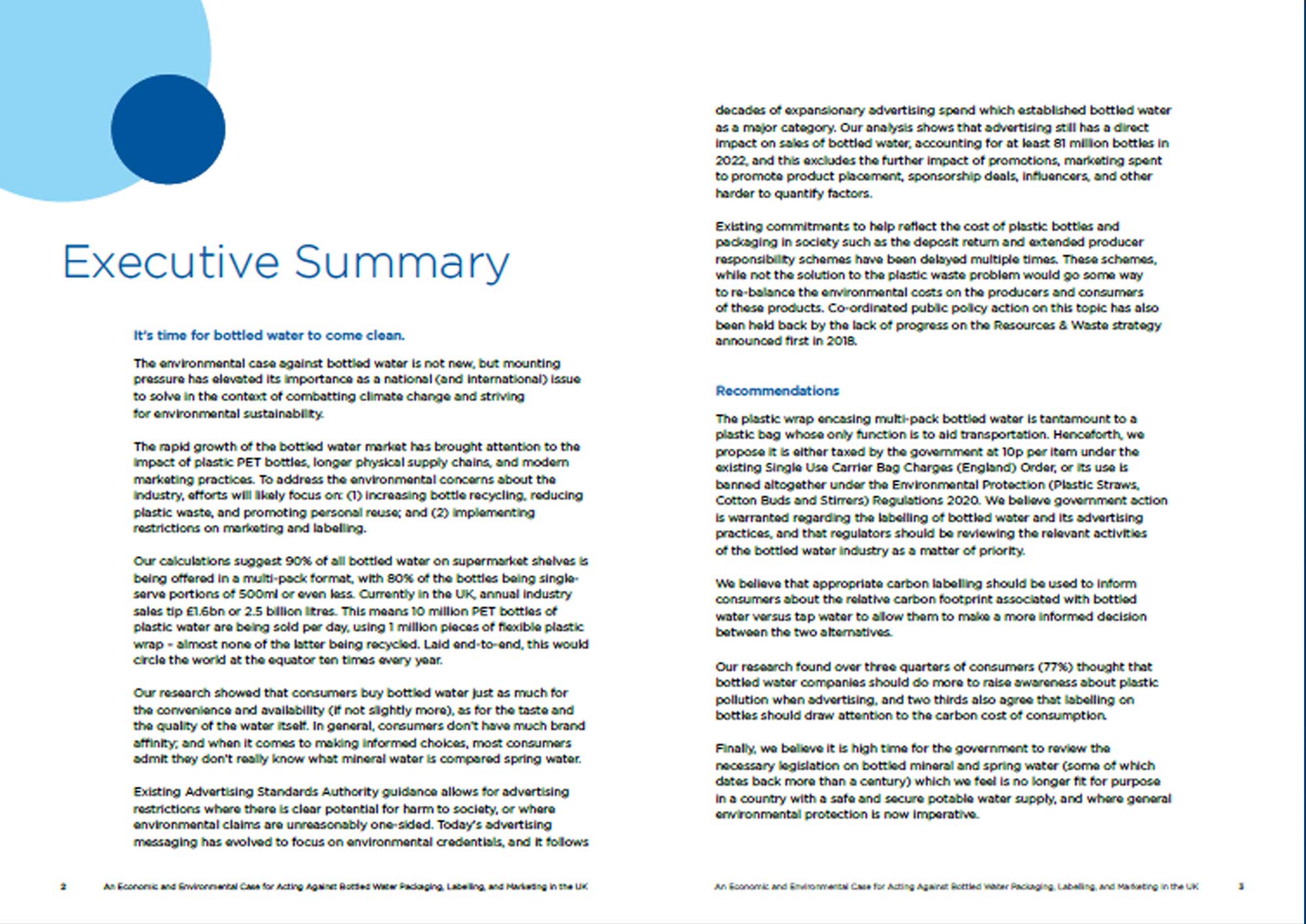 We propose that the Advertising Standards Authority (ASA) and Competition & Markets Authority undertake an immediate review of the explicit and implicit environmental claims and credentials proffered by bottled water manufacturers. This is in context of the negative environmental impact of their industry on society, and also in light of existing ASA rules in place regarding environment claims in particular.