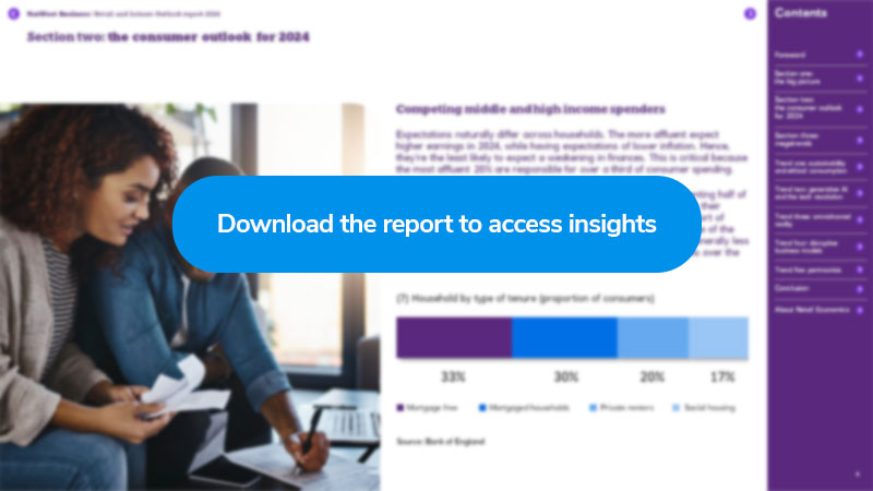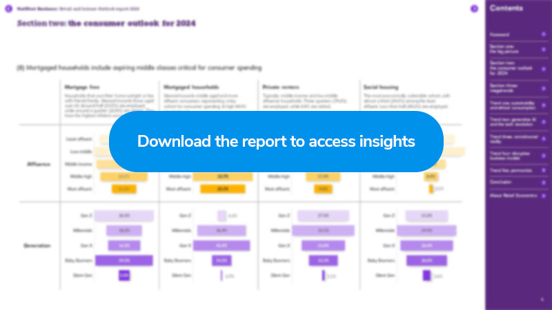 By comparison, mortgaged households and private renters (representing half of households) feel more downbeat about 2024 in general. They expect their personal finances to be weaker by the end of the year. A smaller cohort of households in social housing are extremely pessimistic, reflecting some of the most economically vulnerable individuals. Although consumers are generally less pessimistic than in 2023, it ultimately follows a weakening of finances over the past 12 months.