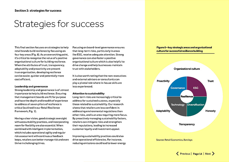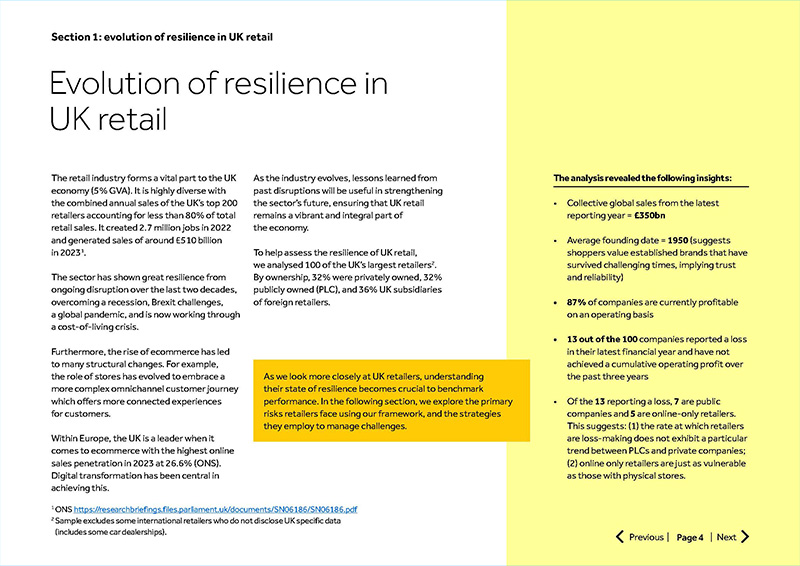 This report was produced by Retail Economics in partnership with Barclays. It included a survey of senior retail executives conducted in May 2024. This survey was used to quantify and explore their views on a range of risk and resilience-related issues within their business and the wider retail industry. Respondents typically included senior-level roles involved in managing risk or audit committees at organisations with a turnover in excess of £6.5 million, often at the C-suite level. In addition, research findings were also included from data contained in the most recent annual reports of 100 of the UK’s largest retailers (note: the sample includes retail and automotive organisations, both public limited companies (PLCs), and privately owned entities, including UK and UK subsidiaries of foreign-owned retailers; and excludes various international retailers who do not disclose UK-specific data). Analysis was conducted by Retail Economics.