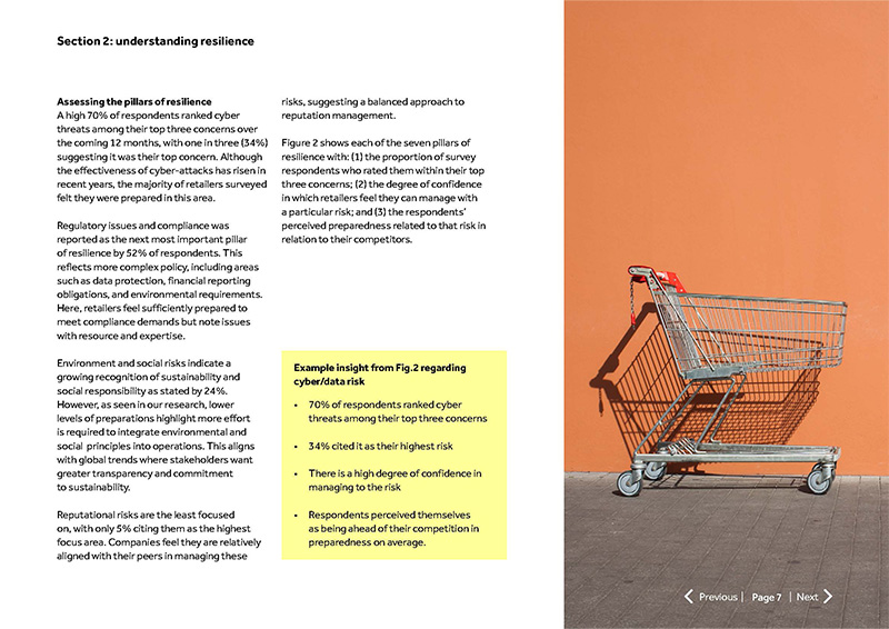 Figure 2 shows each of the seven pillars of resilience with: (1) the proportion of survey respondents who rated them within their top three concerns; (2) the degree of confidence in which retailers feel they can manage with a particular risk; and (3) the respondents’ perceived preparedness related to that risk in relation to their competitors.