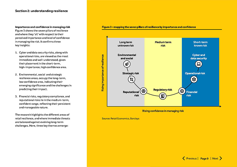 3. Financial risks, regulatory compliance, and reputational risks lie in the medium-term, confident range, reflecting their persistent and manageable nature. The research highlights the different areas of retail resilience, and where immediate threats are balanced against evolving long-term challenges.