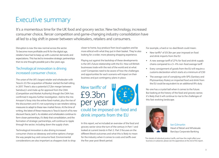 This research was conducted by Retail Economics in partnership with Barclays Corporate Banking. In this report, we focus on a new era for UK food supply chains and the impact of Brexit. Here, we include an overview of the food and grocery sector since the turn of the century in Part 1 and look at current trends in Part 2. Part 3 focuses on the different Brexit outcomes and what this is likely to mean for the industry when it comes to costs and tariffs over the five-year post-Brexit period. Case studies are included, together with a look at Brexit tariffs, and lastly various industry trends to watch out for.