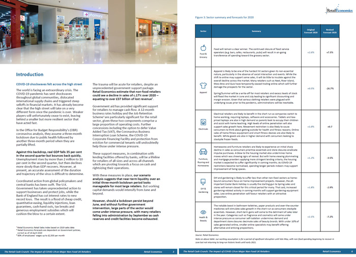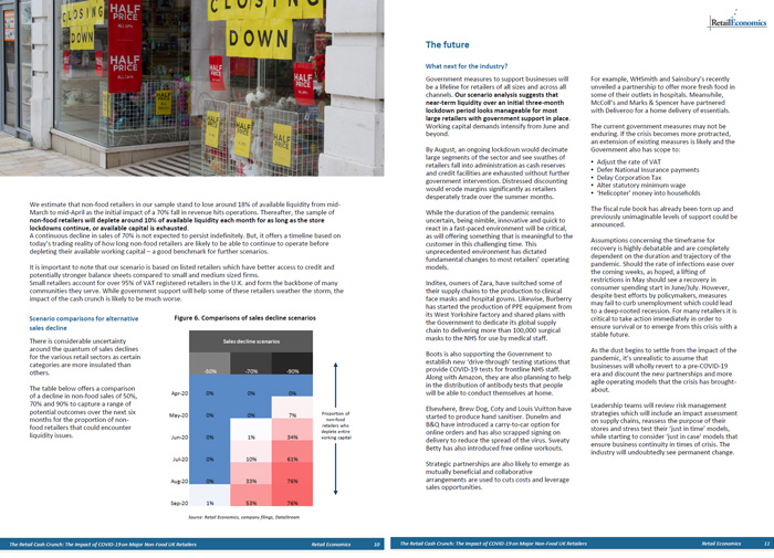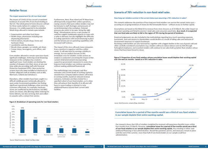 Assumptions are based on the likely hit to revenue from store closures as of 3 March, the wider impact on consumer spending and Retail Economics’ retail sales and consumer panel data. As a result, it is expected that non food sales are likely to fall in the region of 70% during the period of lockdown.