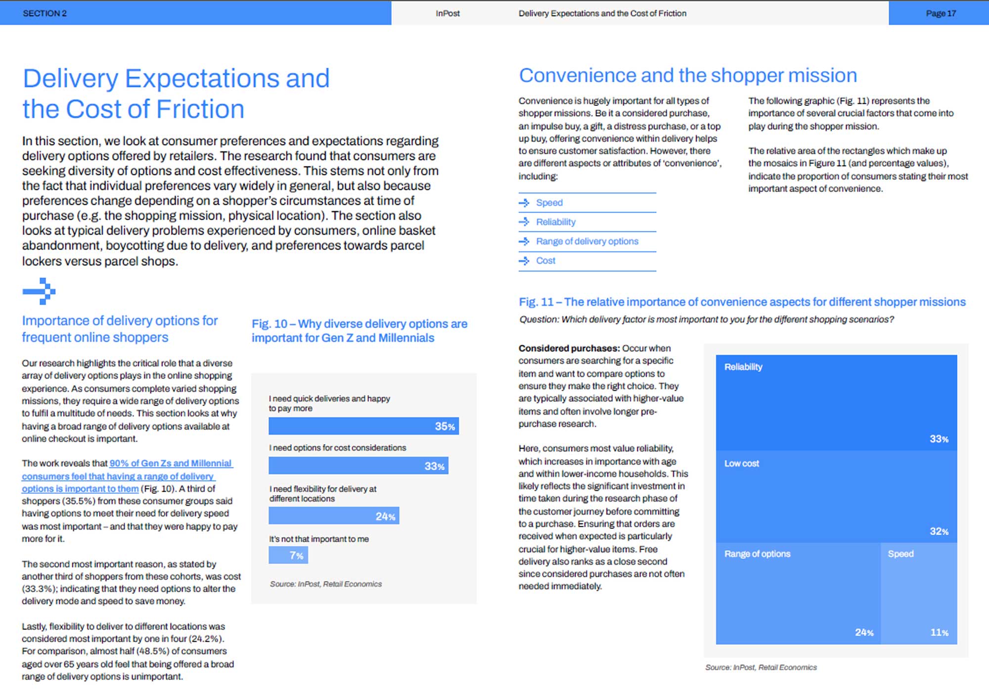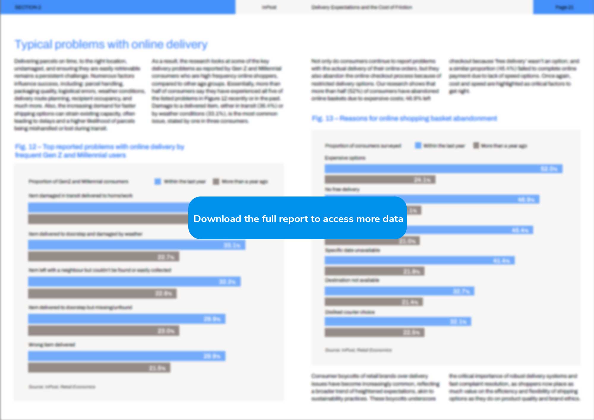 In this section, we look at consumer preferences and expectations regarding delivery options offered by retailers. The research found that consumers are seeking diversity of options and cost effectiveness. This stems not only from the fact that individual preferences vary widely in general, but also because preferences change depending on a shopper’s circumstances at time of purchase (e.g. the shopping mission, physical location). The section also looks at typical delivery problems experienced by consumers, online basket abandonment, boycotting due to delivery, and preferences towards parcel lockers versus parcel shops.