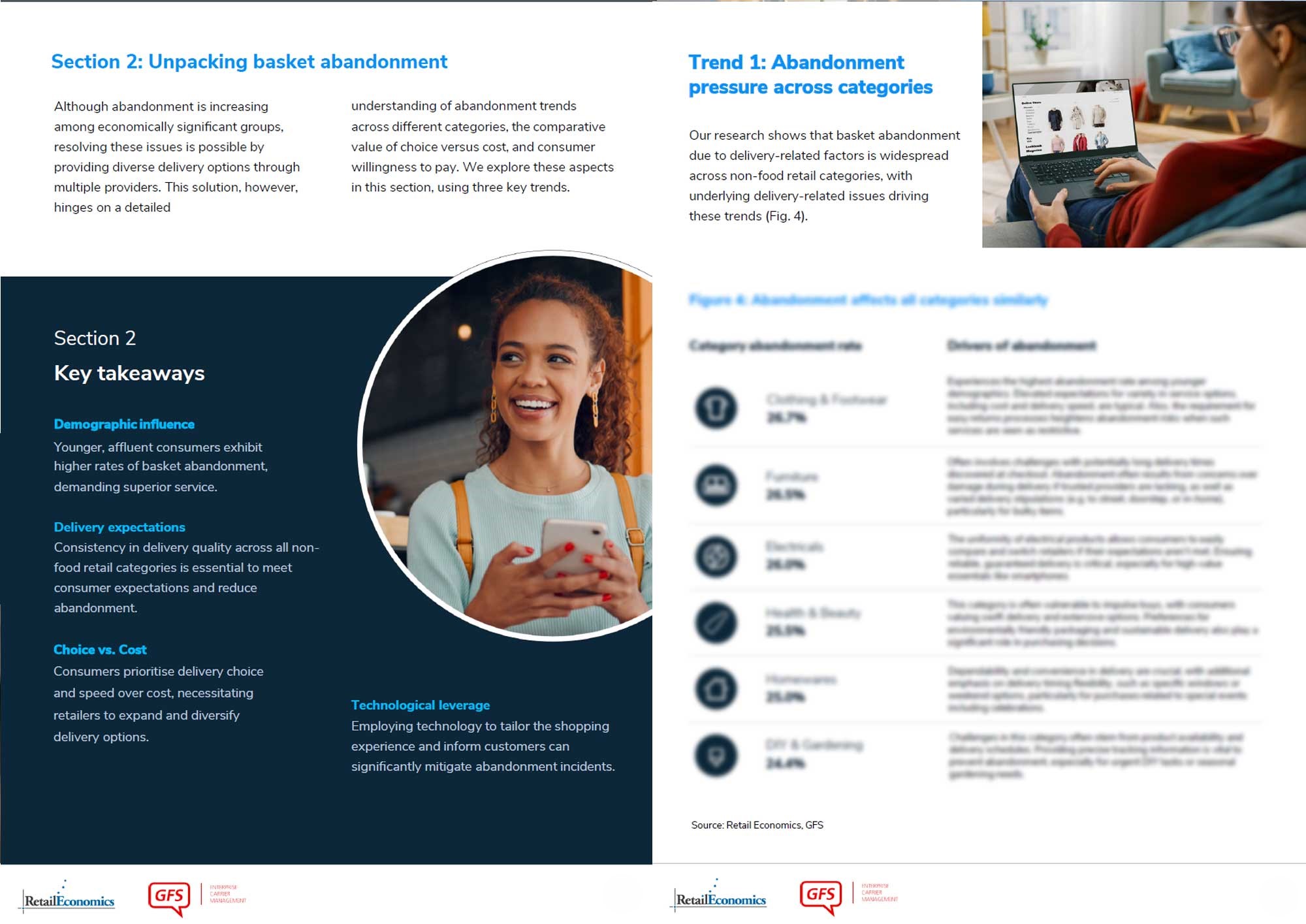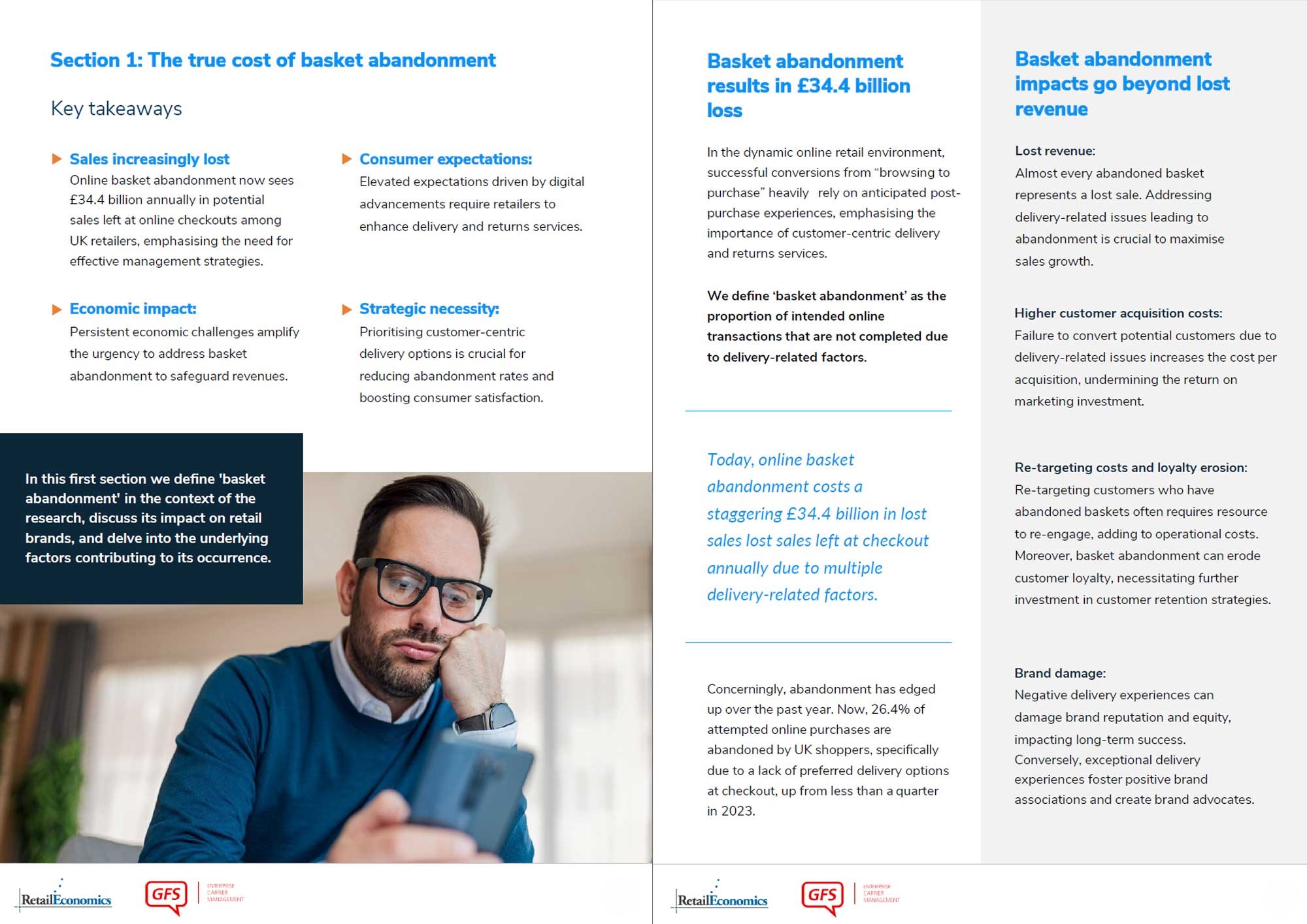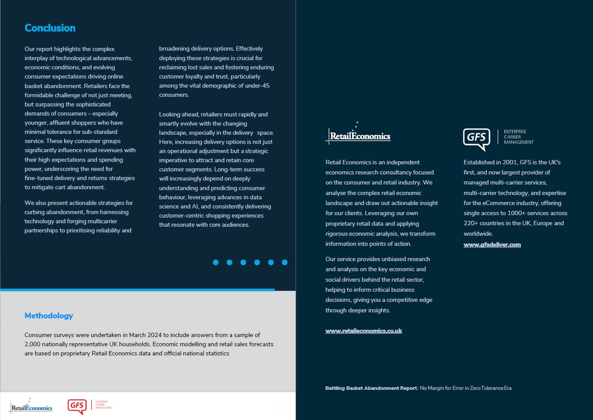 Our report, 'Battling Basket Abandonment 2024', developed in partnership with GFS, delivers crucial insights into the staggering £34.4 billion annual loss UK retailers face due to basket abandonment. It addresses the essential strategies for optimising delivery and returns services to enhance customer satisfaction and retention amidst rising economic pressures and technological advancements.