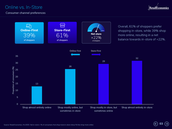 Overall, 61% of shoppers prefer shopping in-store, while 39% shop more online, resulting in a net balance towards in-store of +22%. This is depicted by our 'swingometer' as shown below for the overall sector. The report also includes channel prefernces by retail category as detailed later on (e.g. food, clothing, homewares etc.).