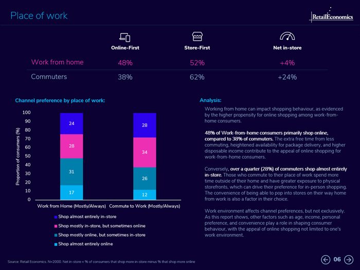 Place of work: Around half (48%) of work-from-home consumers shop primarily online, compared to 38% of commuters.