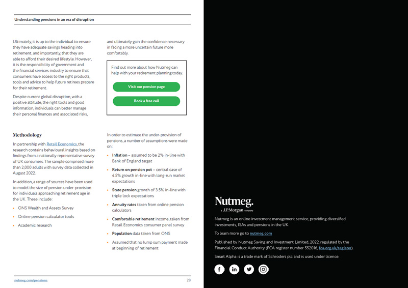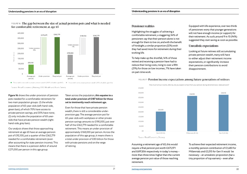 This report produced by Retail Economics in partnership with Nutmeg looks at the state of pensions in the UK. It offers guidance for current and future retirees on the level of savings and income required for retirement. The research can also be used to support financial providers in helping them develop effective strategies, and to better engage clients. The research also presents a calculation for the shortfall between current pension pot values and the income needed for a comfortable retirement.