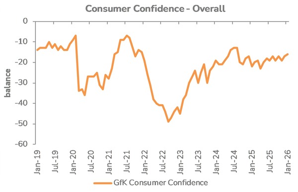 The housing market showed early signs of stabilisation, with house prices rising month-on-month and returning to annual growth. While transaction volumes remain below long-term averages, the absence of further deterioration supports home-related spending at a replacement and upkeep level.